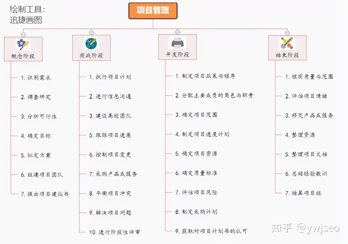 项目生命周期是一个项目从概念到完成所经过的所有阶段。所有项目都可分成若干阶段,且所有项目无论大小,都有一个类似的生命周期结构。以下思维导图从四个阶段对其进行划分,分别是概念阶段,开发阶段,实战阶段以及结束阶段。总结的思维导图很好的进行了说明,希望和可以帮助到大家。