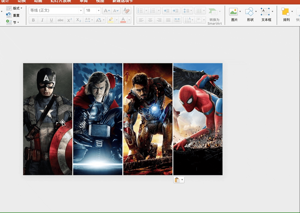 第四步:再次复制一页幻灯片,选中第一张图片,把他裁剪变宽,将后面几个图片向右移动。