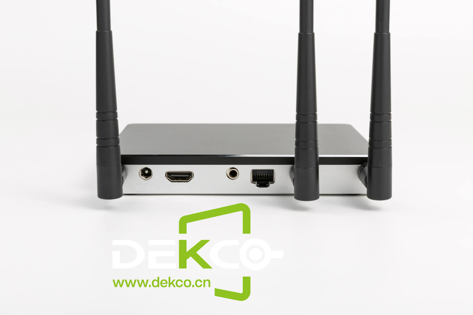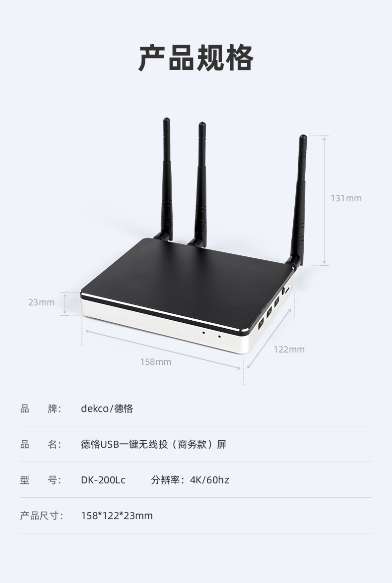 真的只需要一个USB传屏按键插入笔记本电脑的USB接口,就可以实现电脑画面的无线投屏显示了?其实小编还没有跟大家讲解完呢,您看到的USB传屏按键,只是咱们所说的“发射端”,有发射端,肯定就会有接收端了。其实这其中还需要一个类似于像路由器一样体积大小的盒子配合使用,我们俗称“投屏盒子”,投屏按键是发射端,投屏盒子是接收端,信号输出直接输入到显示屏上,也就是小编经常所说的:“一个盒子+一支按键=德恪一键无线投屏方案。下面小编接下来要给大家展示的是德恪USB一键无线投屏(商务款),型号【DK-200Lc】