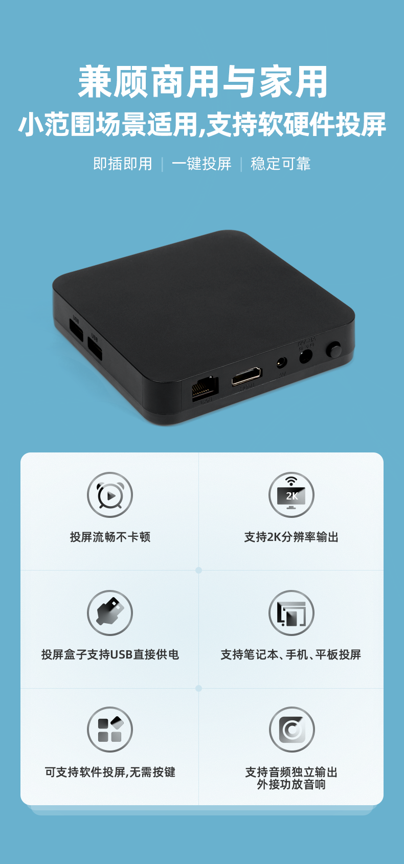 如果您仅仅只是需要应用到投屏功能,用户可以参考德恪投屏在2020年推出的最新款解决方案(迷你款),型号【DK-mini20Y】,适用于小微型企业会议室或家用网课投屏,能满足您最基本的投屏需求,同时支持笔记本电脑,手机,平板的无线投屏。如下图: