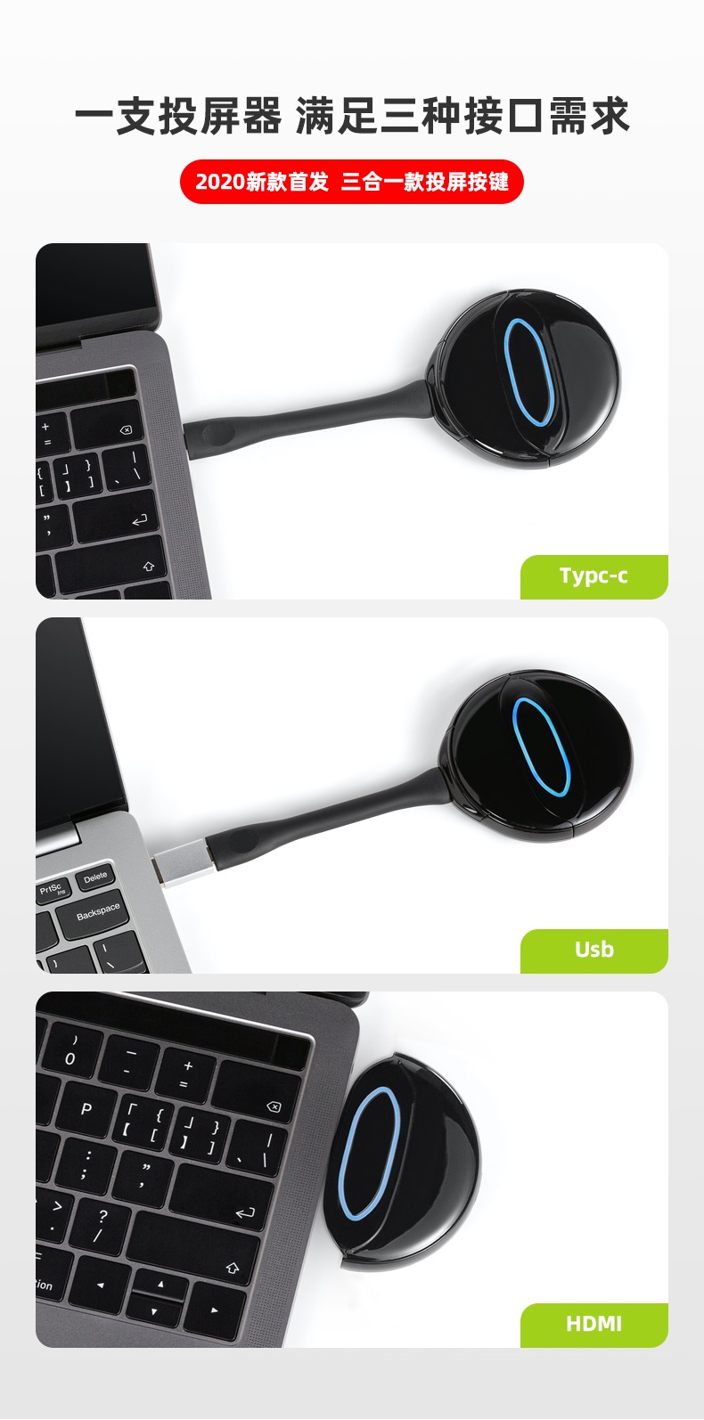 它不仅能给您带来整洁的桌面,稳定的表现,笔记本电脑用户只需一支投屏按键,能分享设备上的内容,并可以随意移动,不用担心因为线缆脱落或线路老化问题,中断分享信号,或者因视频输出接口不匹配等问题,影响会议内容分享。三合一款投屏按键集成了目前笔记本电脑的通用性,USB接口/Type-C/HDMI,您再也不必去购买各种各样的信号转接线或者是转换头了,就连之前放在会议室以备不时之需的有线设备,也都通通不需要啦。正如下面广告语说的那样: