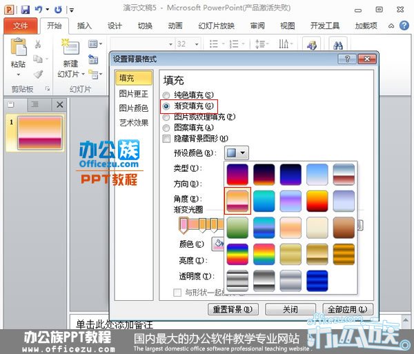 2.操作步骤一、 启动PowerPoint2010,新建空白幻灯片,然后设置背景格式,勾选渐变填充,颜色选择漫漫黄沙。