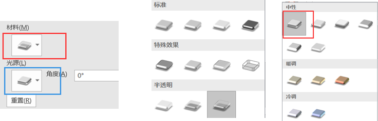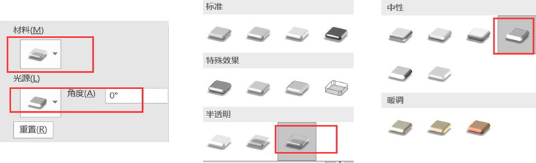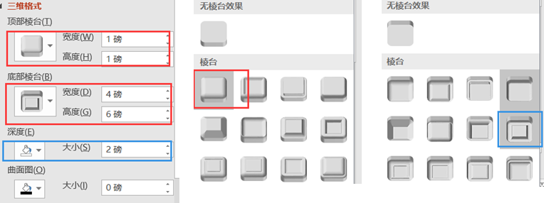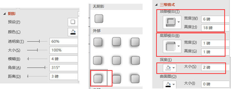 三维格式:顶部棱台-图样,宽度 6 磅,高度 18 磅;底部棱台-圆形,宽度和高度均为 1 磅;深度 -2 磅;材料-半透明-最浅;光源-中性-三点;角度 0°。