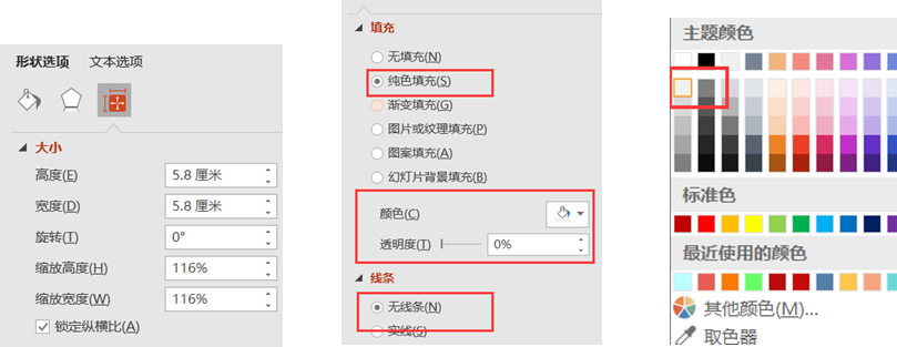 1. 按住键盘shift键,插入一个正圆,锁定纵横比后,调整相应高度和宽度均为5.8 厘米;填充-纯色填充-颜色“白色,背景1,深色 5% ”;线条-无线条。