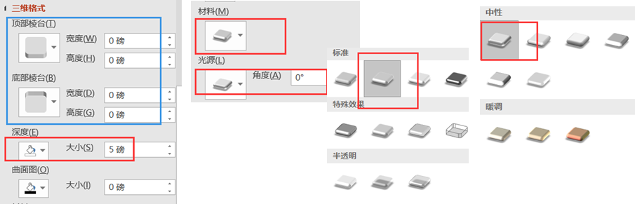 三维格式:深度 -5 磅;材料-标准-暖色粗糙;光源-中性-三点;角度 0°。