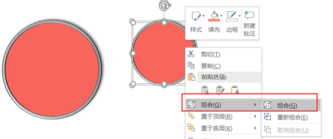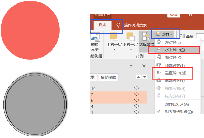 3. 按住 Ctrl 键,鼠标左键(加选操作),选中两个图形;菜单栏-格式-对齐,水平居中,垂直居中;右键组合图形(或者键盘Ctrl+G)。