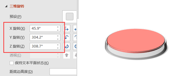 整体三维旋转:X轴旋转 45.9 °,Y轴旋转 304.2 °,Z轴旋转 308.7 °,透视 0° ,距底边高度 0 磅。