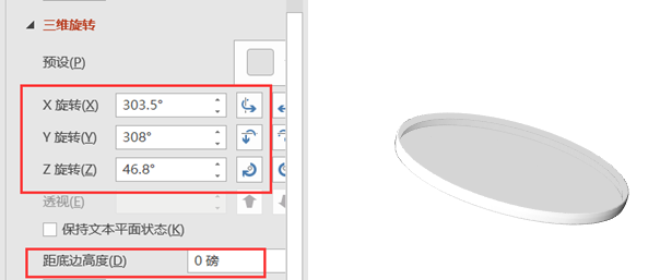 三维旋转:X轴旋转 303.5 °,Y轴旋转 308 °,Z轴旋转 46.8 °,透视 0° ,距底边高度 0 磅。
