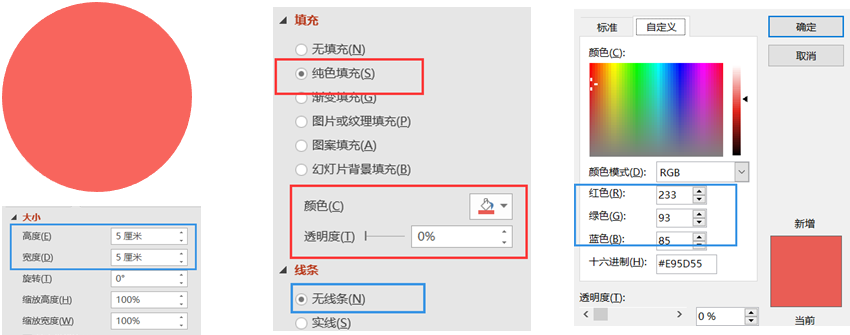 2. 按住键盘shift键,插入一个正圆,锁定纵横比后,调整相应高度和宽度均为 5 厘米;填充-纯色填充-颜色-其他颜色 RGB“233,93,85 ”,透明度0% ;线条,无线条。