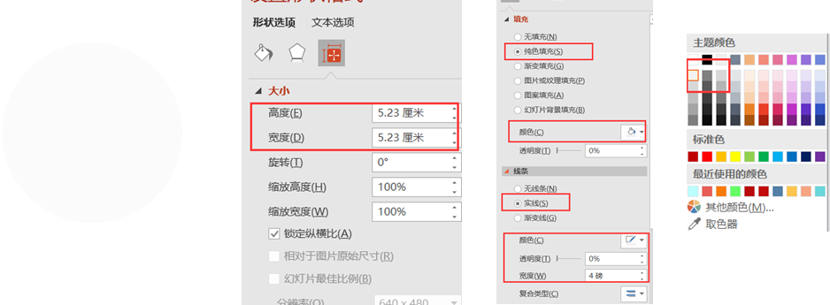 1. 按住键盘shift键,插入一个正圆,锁定纵横比后,调整相应高度和宽度均为5.23 厘米;填充-纯色填充-颜色“白色,背景1,深色 5% ”;线条-实线,宽度4 磅,颜色“白色,背景1,深色 5% ”。