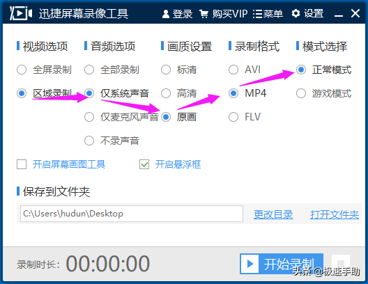 打开【迅捷屏幕录像工具】这个软件之后,就会弹出所对应的【功能界面】,在录制之前,首先需要在这个功能页面中进行录制参数设置。如下图所示的【视频选项】、【音频选项】、【画质设置】、【录制格式】、【模式选择】五个模块需要进行参数设置。