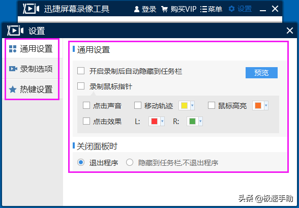 以上这些最基础的设置都调整为合适的选项以后,在页面的右上方点击【设置】按钮。然后会会弹出【设置】窗口,这个窗口里包含【通用设置】、【录制选项】和【热键设置】三个调整模块。大家可以根据具体录屏需要来自行设置,设置完成后直接关闭窗口,然后回到主页面即可。
