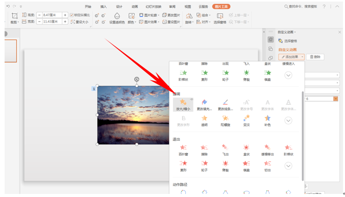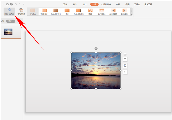 2.多个动画效果同时播放首先,我们插入一张图片为例,单击工具栏动画下的自定义动画