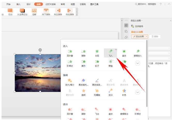 3.先给图片设置一种动画,单击添加效果,在下拉菜单当中选择飞入效果