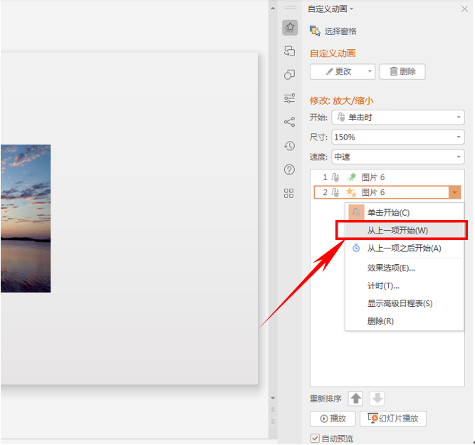 5.然后我们就看到旁边的动画窗格里显示了两个动画,选中第二个放大缩小的动画,单击右键,选择“从上一项开始”