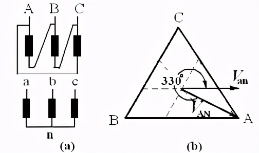 从相量图分析,跟高压A相同相的电压是。另外在这个基础上还有,合成低压是。跟的相位差是330度。因此,这种联结方法的标号属于Yz11。这样结线的好处是可以降低零序电流的影响。