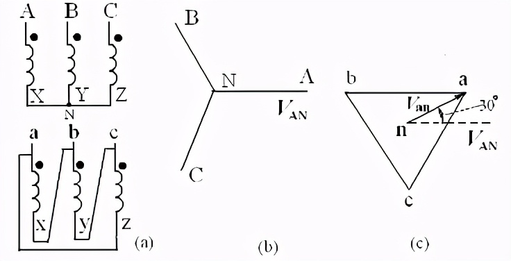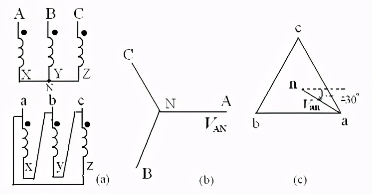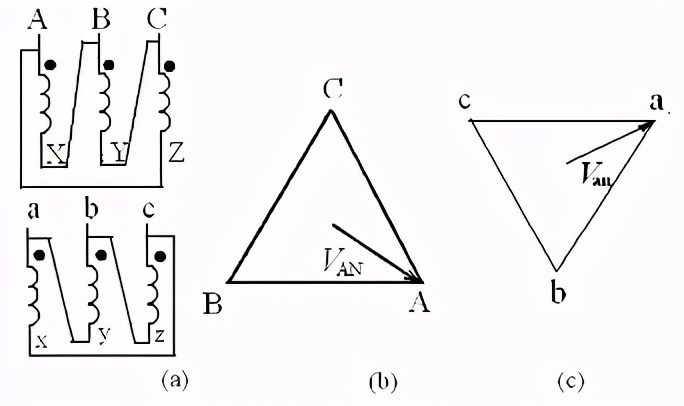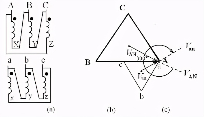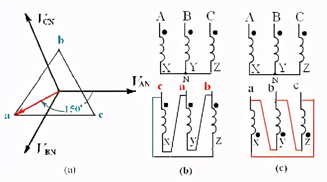图(b)是高压侧的正序相量图。电压是假想的相电压。图(c)是低压侧的相量图。为什么三角形要倒立着画?这是因为高压侧的电压是,跟它绕在同一铁芯柱上的低压是,画相量图时,二者必须是同相的。除了要满足这个要求之外,还必须满足低压相量也是正序的要求,因此,低压侧的相量只好倒立了。