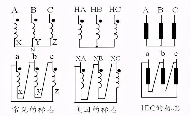 通常把跟线路端子连接的绕组那端称为首端(或始端),在我国,线路端子的符号就是绕组的首端符号。也就是说,首端没有专门的符号。把同一个绕组的另一端称为尾端(或末端),高压绕组的尾端通常用大写的X、Y、Z表示;低压绕组的尾端通常用小写的x、y、z表示。见图1,这是我国的标记方法。