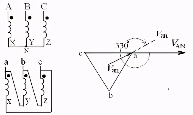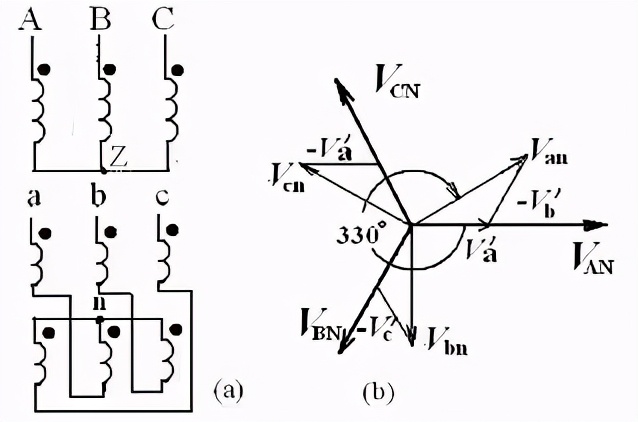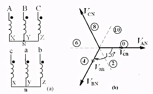 我们知道,对于单相变压器来说,高压侧的电压跟低压侧的电压之间的相位差,不是零度,就是180度。但是,对于三相变压器来说,情况就要复杂得多。它们之间的相位差在零至330度之间。间隔是30度。