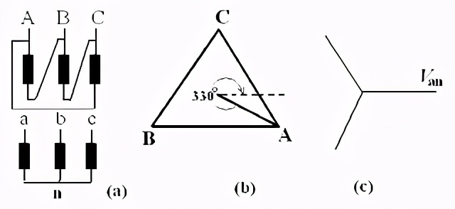 步骤4:求落后于的角度 从三角形的中心引一条平行于的平行虚线(见图c),这条线就代表高压侧的A相电压。