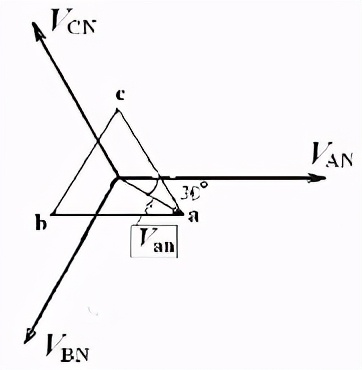 步骤3: 求假想的相电压 从三角形的中心向三角形的顶点a作一条引线。这条线就是假想的相电压。见图(c);