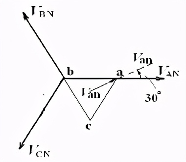但是,问题来了:对于三角形结线来说,相电压就是线电压,那么,究竟采用哪个电压作相电压呢?解决方法是:把表示三角形结线的等边三角形相量的顶点a角做一个平分线,把这个平分线的相量就当作是A相的相电压。这当然是认为社定的。