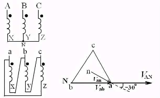 对于Y形结线来说,高压侧的中性点引出线用大写的N字表示;低压侧的中性点引出线用小写的n字表示;