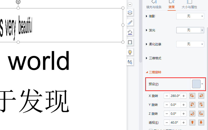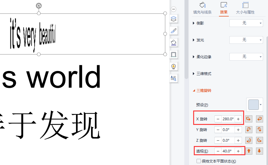 第三步:我们将第1个文本框的【X旋转】设为280,【透视】设为40,呈现出的就是下图的效果。