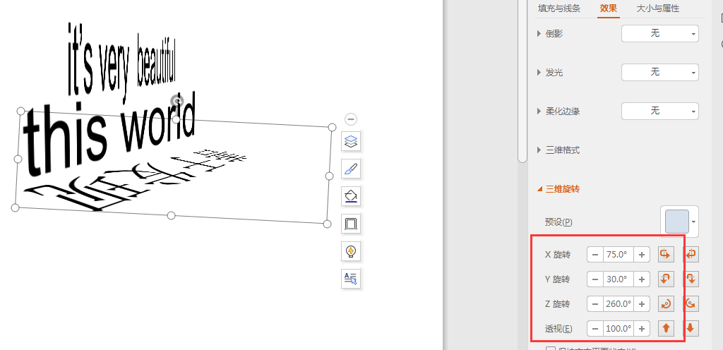 第五步:将最下面的第3个文本框的【X旋转】设为75,【Y旋转】设为30,【Z旋转】设为260,【透视】设为100,然后将文本框旋转移动调整好位置。效果如下图: