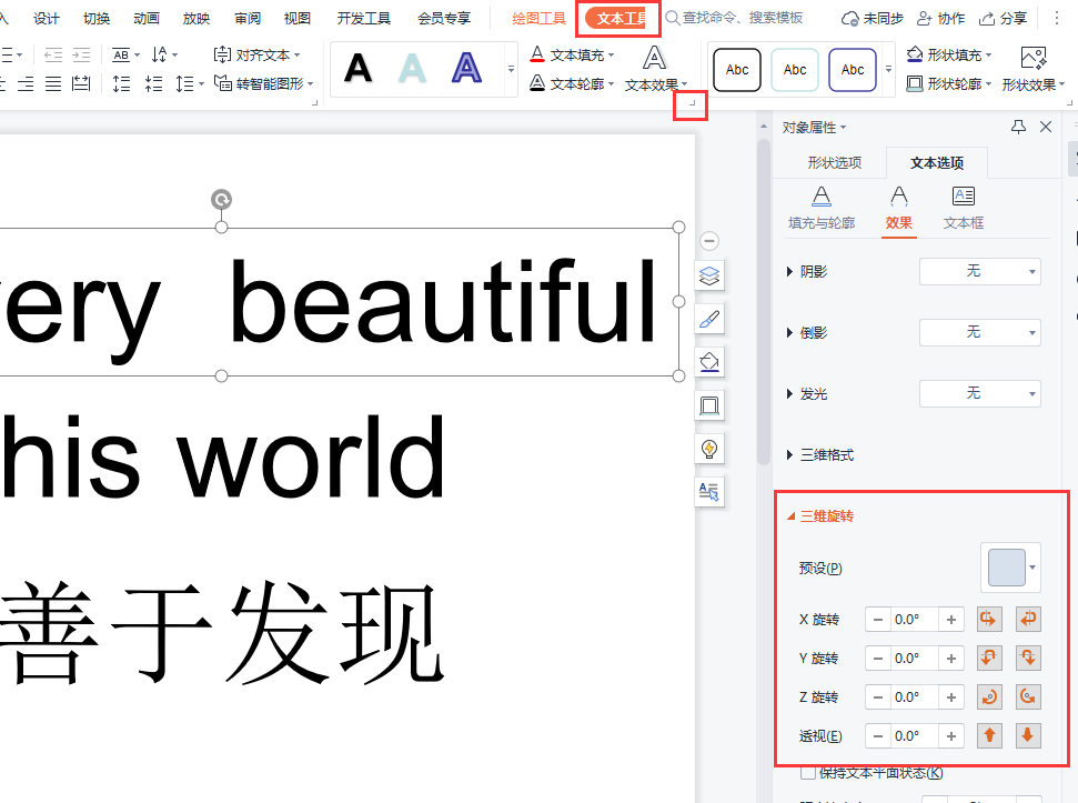第二步:选择最上面的第1个文本框,最上面任务栏会出现【文本工具】选项,点击【文本效果】右下角的小箭头,PPT页面右侧会出现【对象属性】栏,里面我们可以设置【三维旋转】。