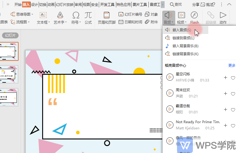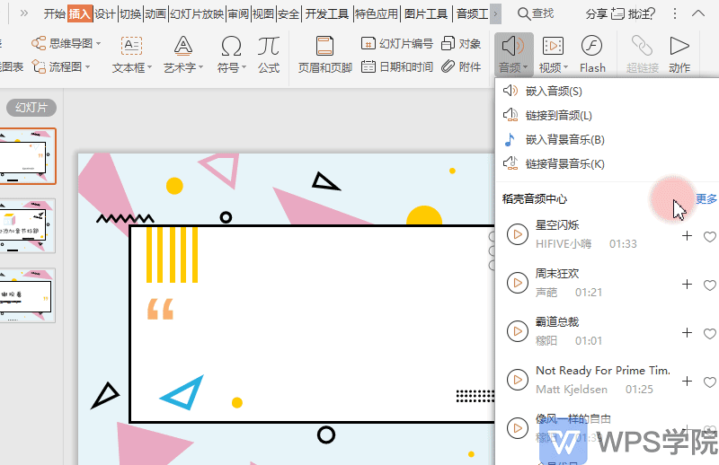 21.■ 如果你是稻壳会员,在“音频”-“稻壳音频中心”-“更多”,在此可选择各类型的BGM,点击插入即可