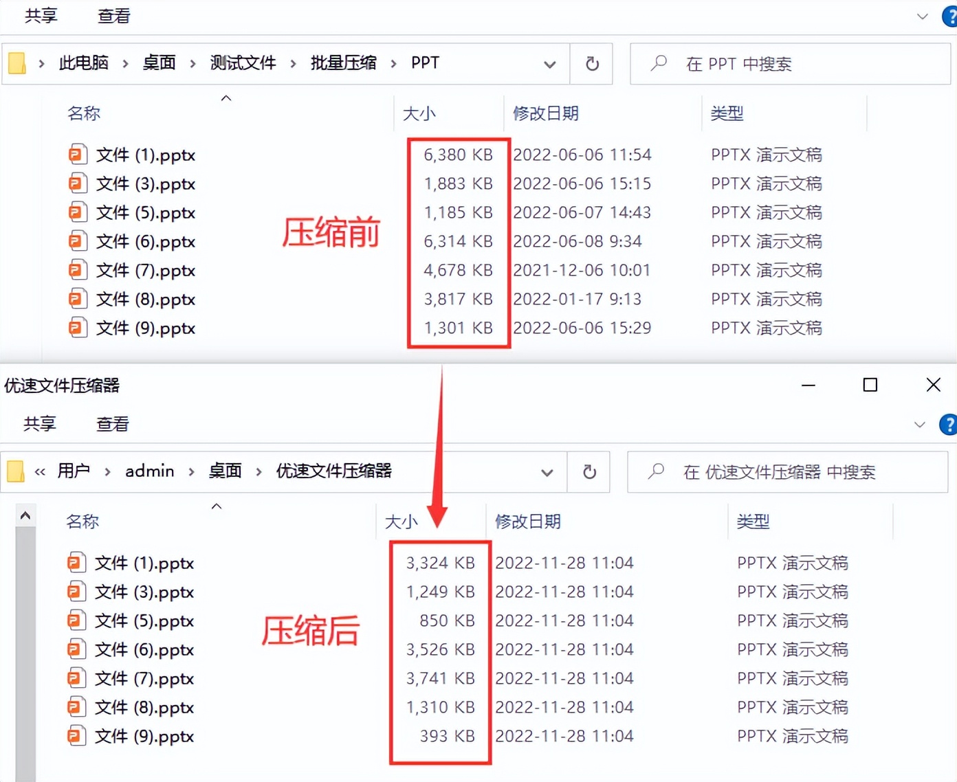 10.步骤5、最后我们来将压缩后的PPT文件跟压缩前对比一下,这样可以更明显的看出压缩效果,如图所示,压缩后的kb确实比压缩前小了很多,ppt文件成功被压缩变小以上就是小编为大家分享的ppt太大无法上传怎么压缩变小专业压缩方法的整个操作步骤了,小编已经尽量详细的把操作步骤表达出来,只希望大家看了就懂