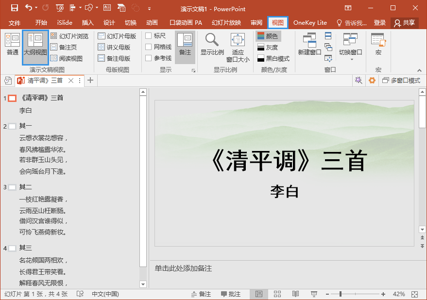 4.3、在[视图]选项卡下的[演示文稿视图]功能组中,将[大纲视图]切换为[幻灯片浏览]视图,可见所有幻灯片中的文字字体全部变为了"隶书"