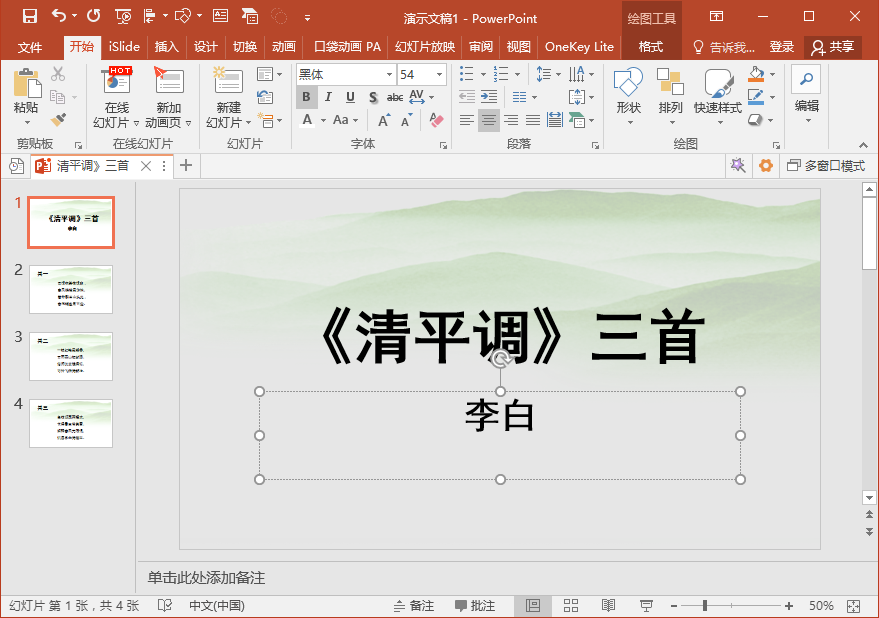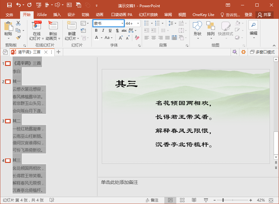 1.下图为一份4页的PPT演示文稿,幻灯片中的文字字体不统一,有黑体有宋体,现在我们想要快速将所有文字字体统一修改为隶书。