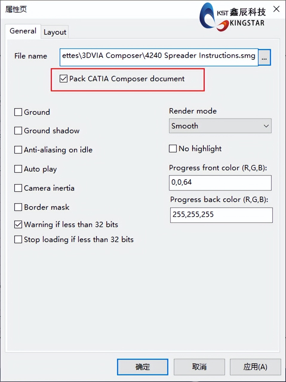 7.七:在属性页当中可以对Composer文件进行设置,也可以勾选上【Pack CATIA Composer document】将Composer文件打包到PPT文件中,这样就不用担心Composer文件被删除