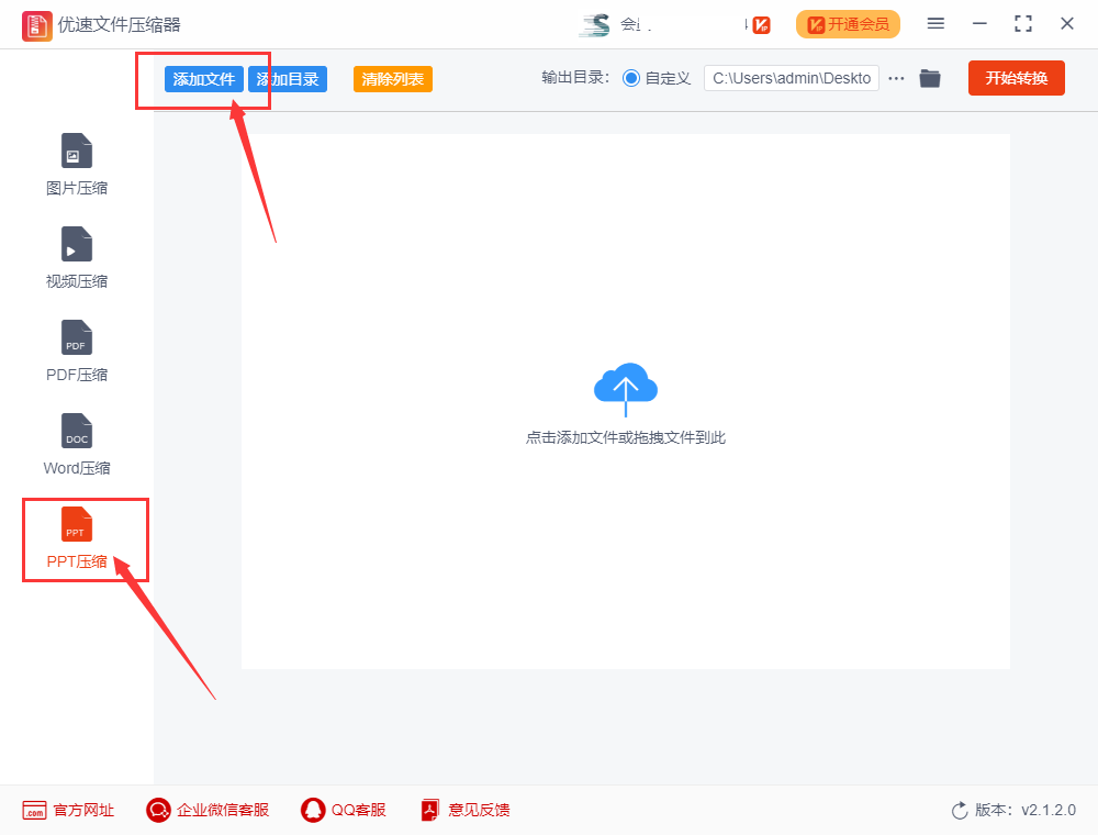 7.选择工具左边区域里的【PPT压缩】功能,再点击左上角【添加文件】按钮将需要压缩的ppt文件添加到软件中,支持批量压缩,可以同时添加多个ppt文件到软件。