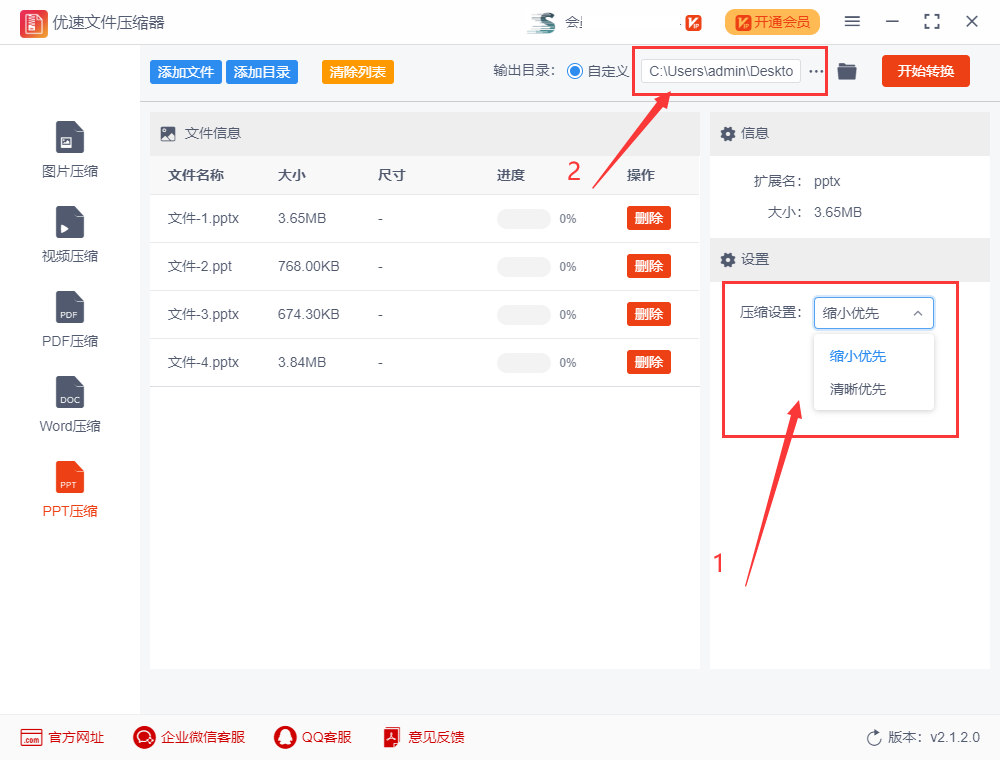 8.步骤2,如下图所示,先进行压缩设置,选择压缩方式(两种压缩方式,缩小优先和清晰优先);然后在上面选择输出目录文件夹,用来保存压缩后的ppt文件