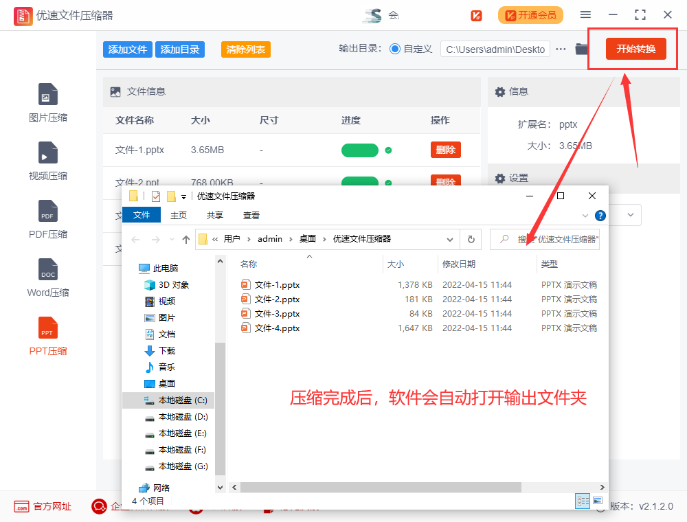 9.步骤3,点击【开始转换】红色按钮启动压缩,稍微等待一会,压缩完成后软件会自动打开输出文件夹,可以看到所有压缩后的ppt文件全部保存在这里了