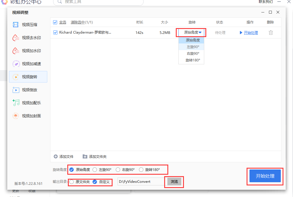 13.3、将视频文件导入后,在文件右侧“旋转”可以设置角度,在左下角“旋转角度”中也可以设置(原始角度/左旋90°/右旋90°/旋转180°)
