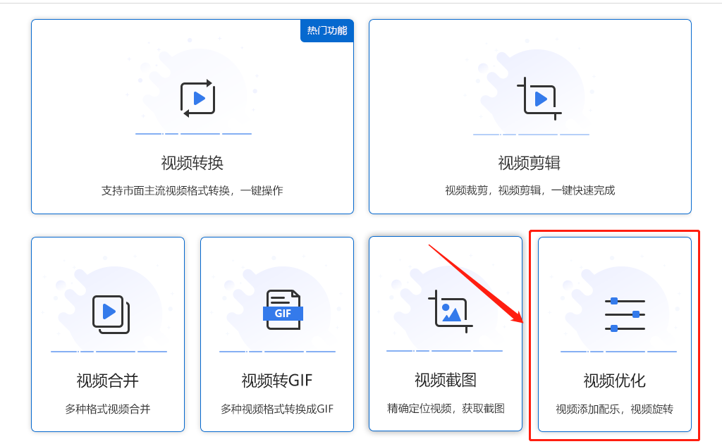3.1、打开下载完成的风云视频转换器APP,找到第二栏最后一个功能“视频优化”(包括了视频画面旋转功能),点击进入。