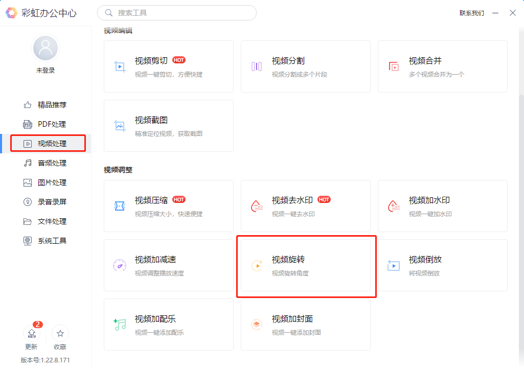 11.1、打开电脑上的彩虹办公中心,在左边菜单栏中,选择“视频处理”,再在右侧点击“视频旋转”功能进入。