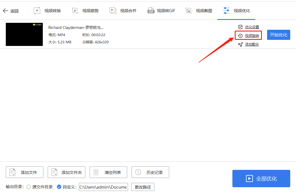 4.2、进入“视频优化”界面,找到左下角“输出目录”,勾选“源文件目录”或“自定义”(点击右侧“更改路径”,选择文件保存位置)