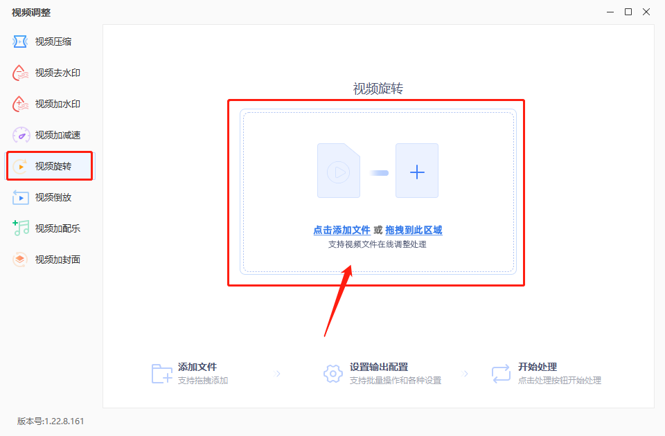 12.2、在弹出窗口中,点击左侧“视频旋转”,将视频格式文件拖拽到该区域,或者点击区域内任意一处,将视频文件添加进来