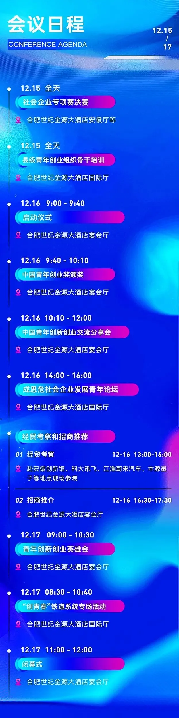 承办单位:中国青年创业就业基金会、中国青年企业家协会、中国农村青年致富带头人协会、中国青年创业联盟、共青团安徽省委员会、合肥市人民政府