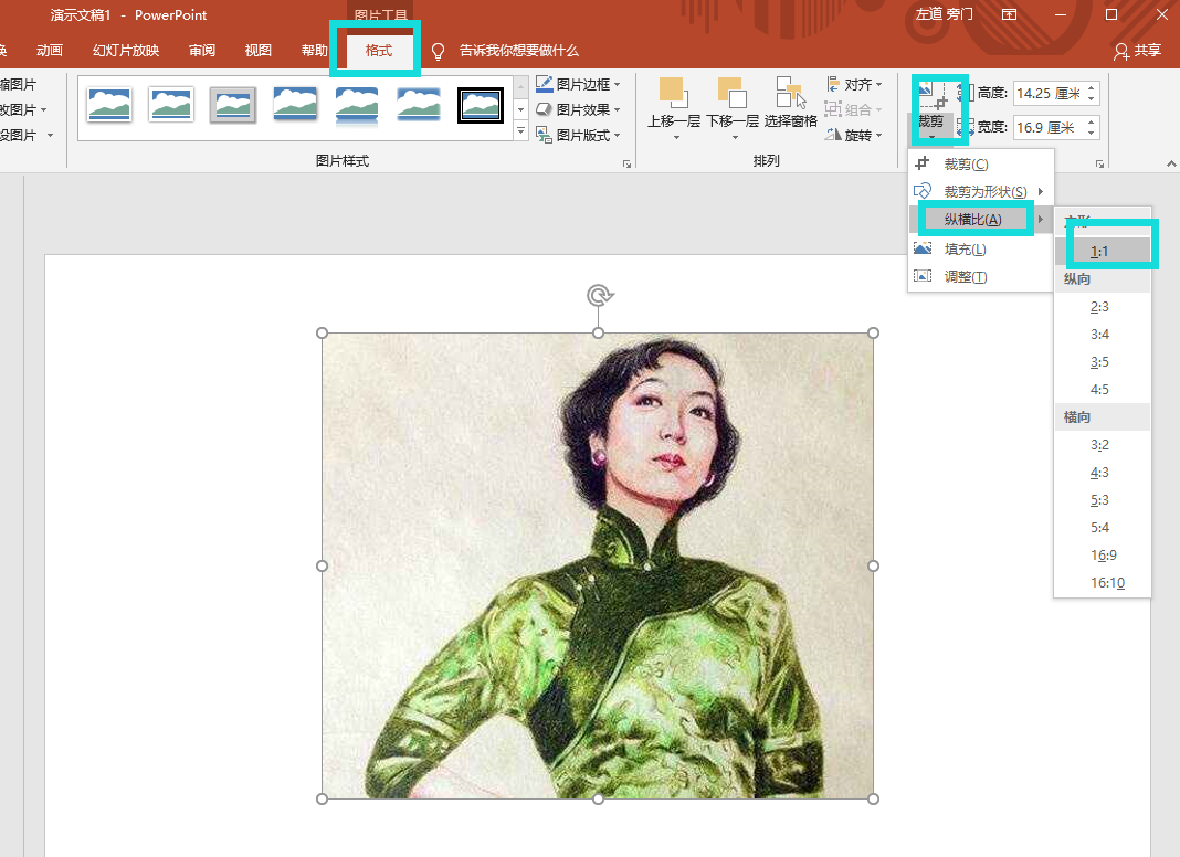 5.将图片裁剪为1:1的正方形,可以平移到合适的位置,然后按着shift键点击“裁剪为形状”的“圆形”就可以啦