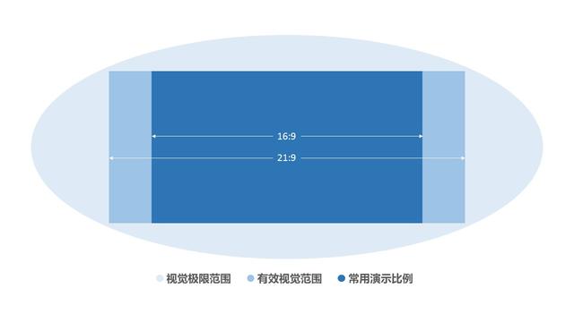 最中心的聚焦的视野范围大概其实是像图上这样的。这个椭圆的范围内是我们视野的极限范围,那么有效的视觉范围比例大概是中间这块偏蓝一点的区域,一个21:9的区域。而我们常用的16:9这个比例,比视野的有效视距范围距离稍微的小一点。其主要目的是防止我们的一些信息放在过于边上而被忽略掉。同时也规避掉了投影在屏幕上画幅大小的问题。当然16:9的比例,看起来会也更加符合人眼的视觉范围,也就是说看起来会让人感觉更大气更舒服。所以,现在大部分的演示文件,我们通常都会以16:9这个比例去做。