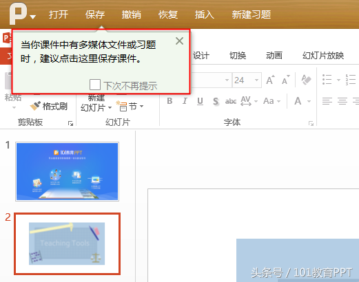 当您制作课件时,首次从教学资源库中选择插入多媒体资源、3D资源、习题、学科工具等内容时,提供了贴心的保存提示。