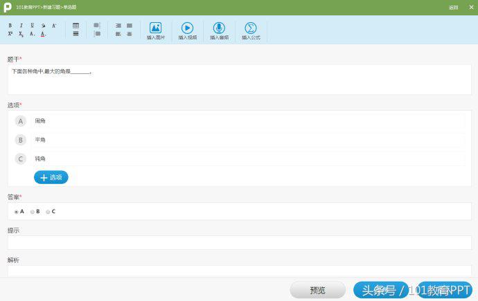 以单选题为例,导入范例后的编辑界面如下,简要填充即可得到您想要的习题效果,瞬间拥有领先一步的快感~