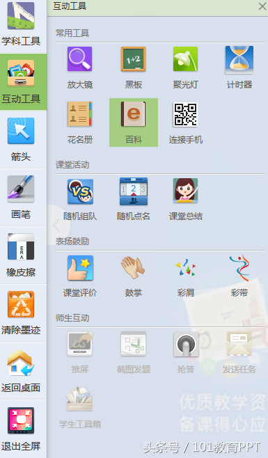 在101教育PPT处于放映状态,若无学生端的情况下,老师将温馨地看到,不可用的互动工具默认显示为灰色状态;另外,课堂活动工具需学生端配合使用。