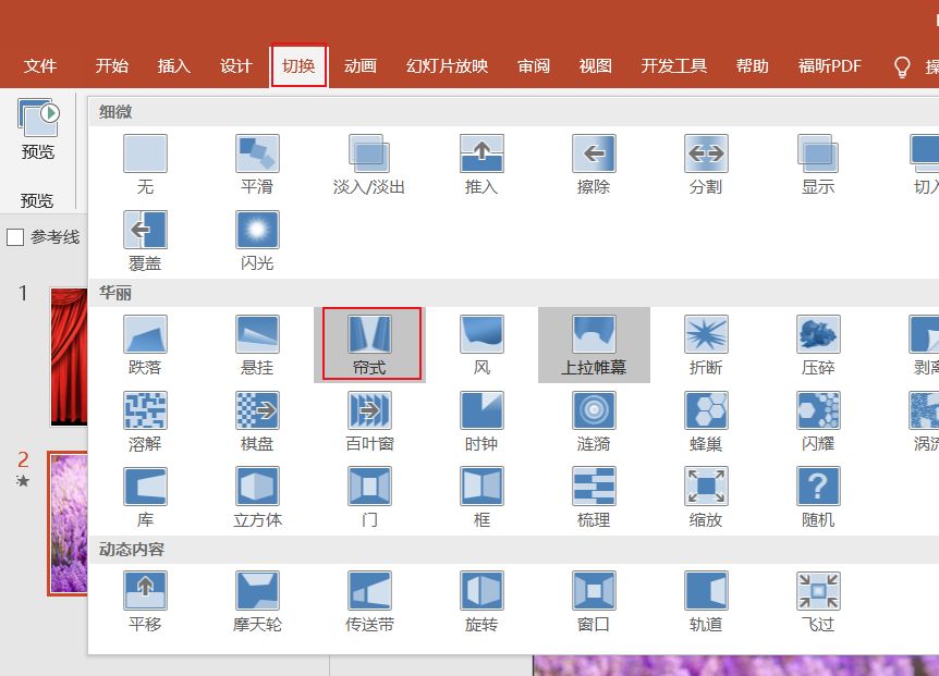 3.三、设置切换的方式,点击菜单栏【切换】-找到【帘式】,设置完成!